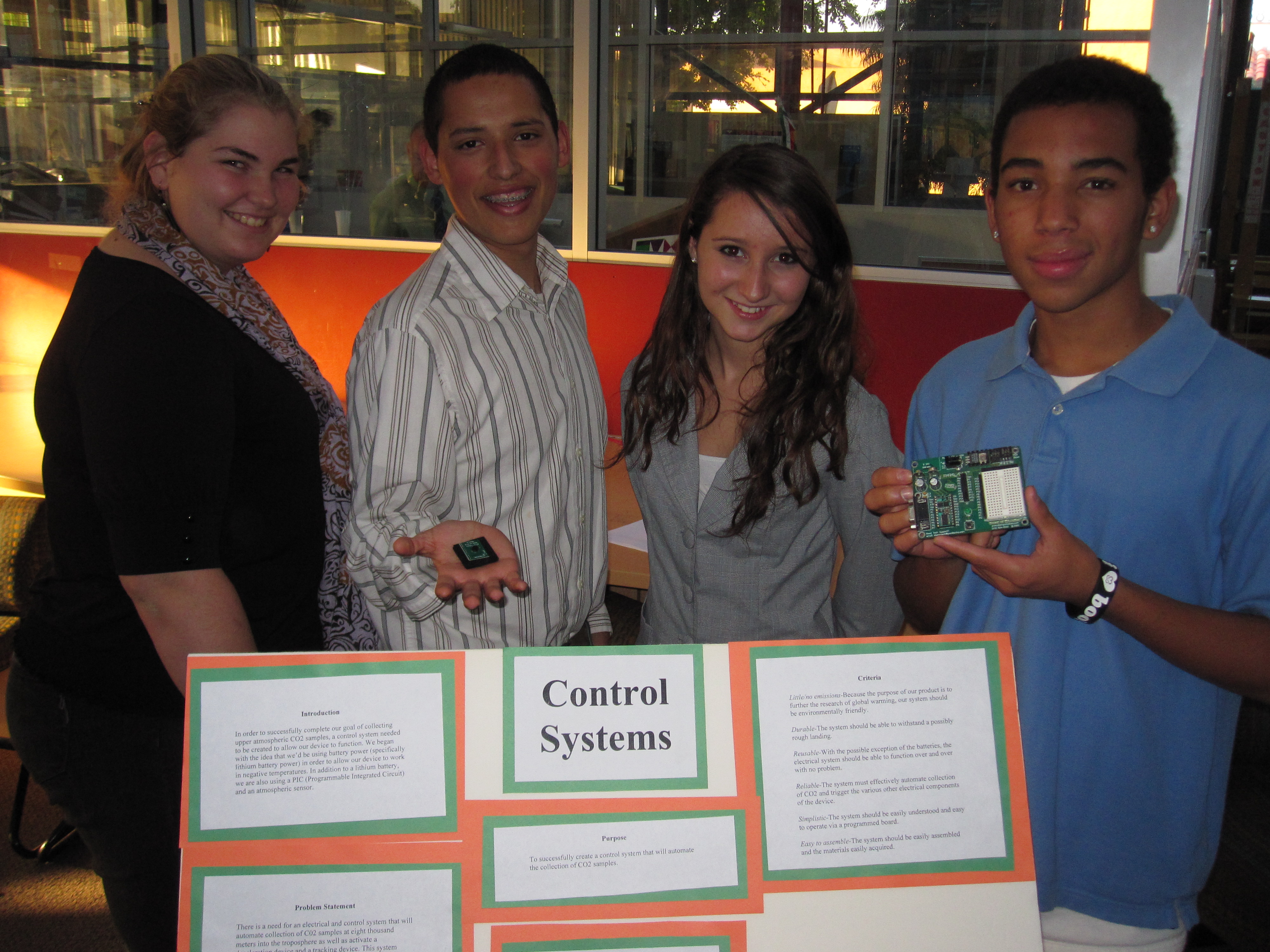 The project concluded with a community presentation of the student’s work separated into panels of teams. The students presented what they had learned from this experience of working in groups and contributing to a larger product just as a company might in the private sector. One important lesson learned was to hit deadlines before they are due. This project dealt with the challenges of fitting project time within a school’s normal schedule and the device was not completely finished. However the wisdom gained from this balloon sampler may be the greater product of this experience and we look forward to more excellent projects from this amazing group of students.
